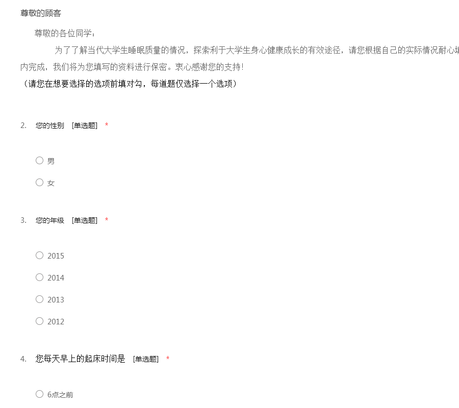 尊敬的各位同学: 为了了解当代大学生睡眠质量的情况,探索利于大学生身心健康成长的有效途径,请您根据自己的实际情况耐心填写调查问卷。本次问卷将在五分钟内完成,我们将为您填写的资料进行保密。衷心感谢您的支持! (请您在想要选择的选项前填对勾,每道题仅选择一个选项)