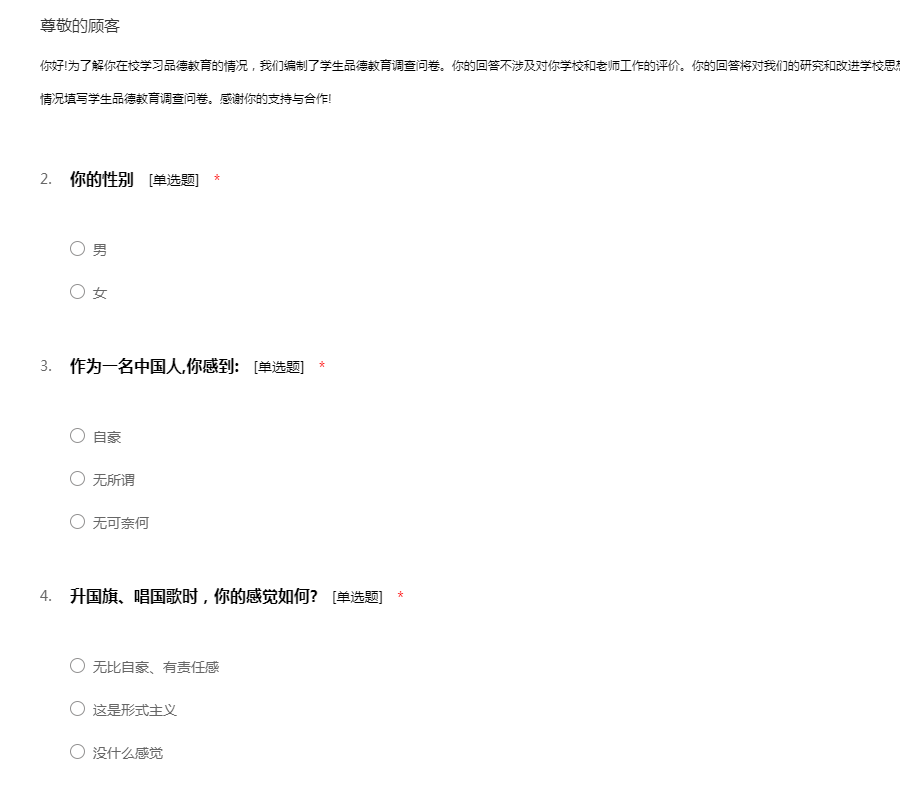 你好!为了解你在校学习品德教育的情况,我们编制了学生品德教育调查问卷。你的回答不涉及对你学校和老师工作的评价。你的回答将对我们的研究和改进学校思想品德课堂教学很重要!请你根据自己的实际学习情况填写学生品德教育调查问卷。感谢你的支持与合作!
