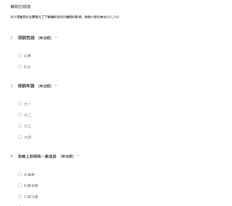 本次调查目的主要是为了了解睡前活动对睡眠的影响。谢谢大家的参与O(∩_∩)O