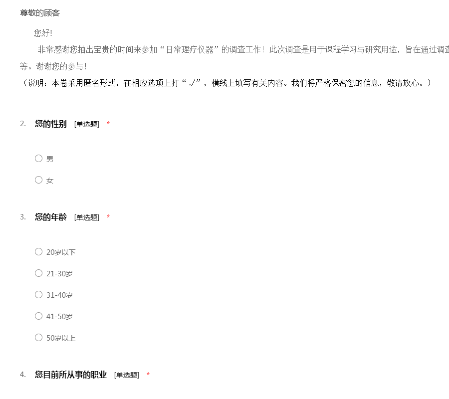 您好! 非常感谢您抽出宝贵的时间来参加“日常理疗仪器”的调查工作!此次调查是用于课程学习与研究用途,旨在通过调查来了解日常理疗仪器的认识与需求等。谢谢您的参与!(说明:本卷采用匿名形式,在相应选项上打“√”,横线上填写有关内容。我们将严格保密您的信息,敬请放心。)