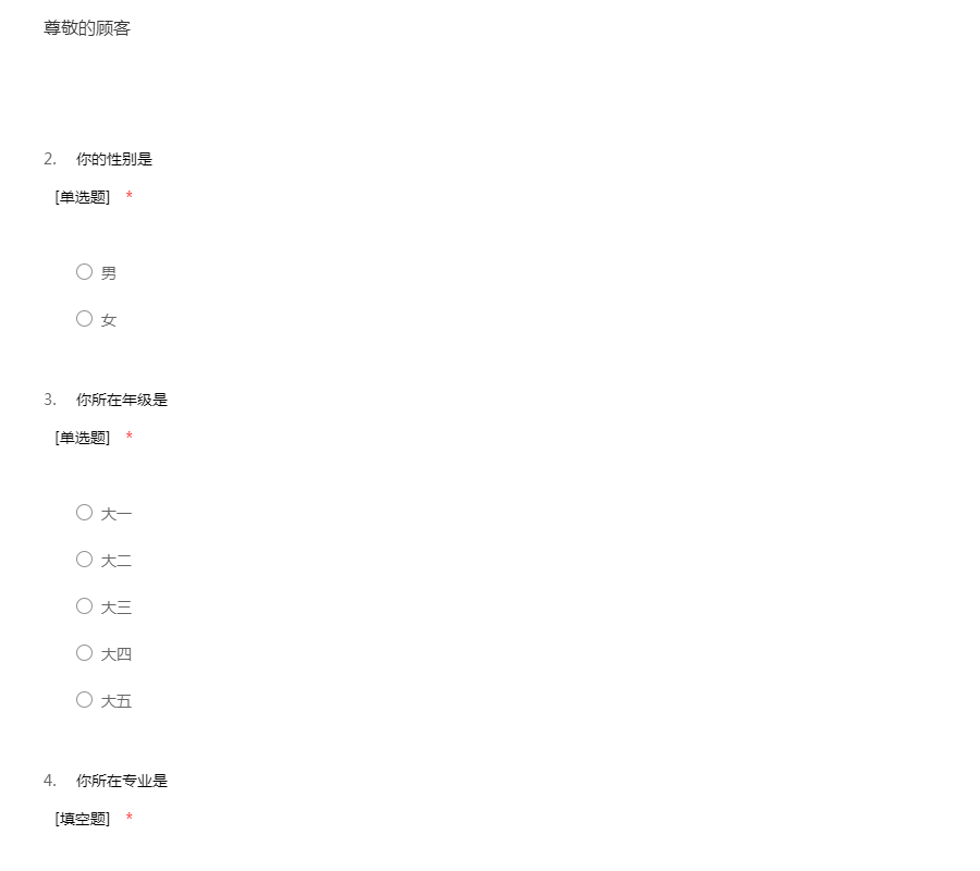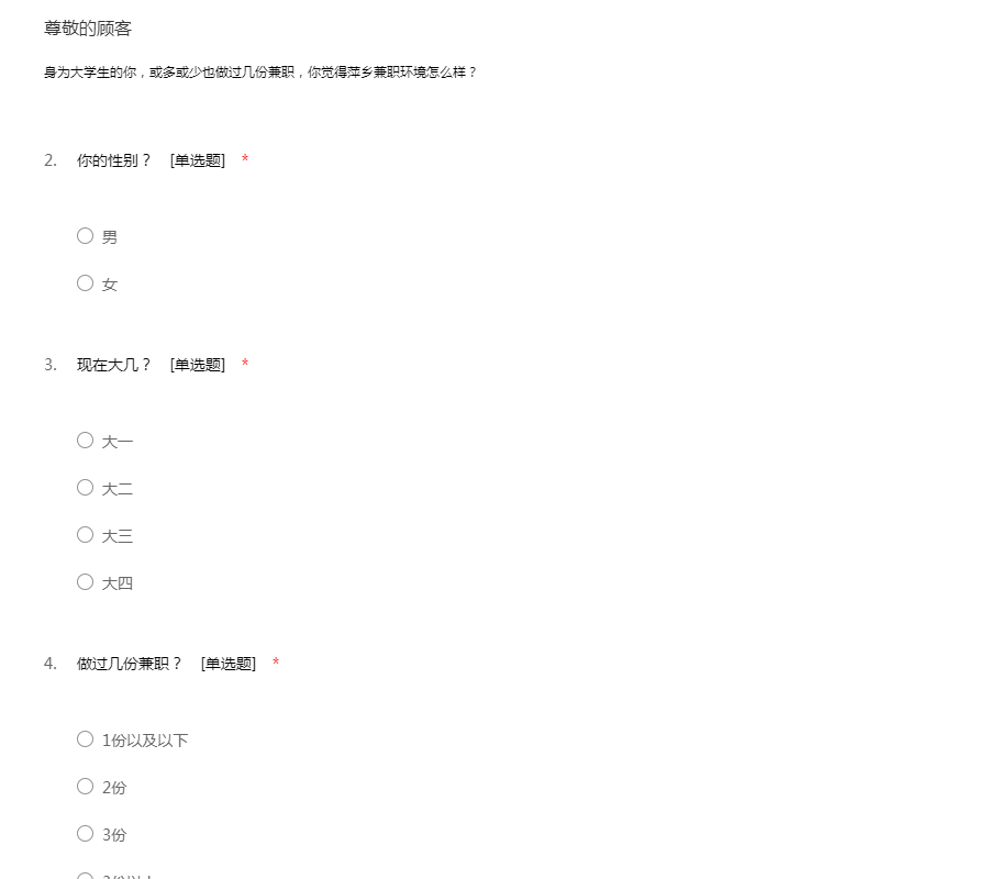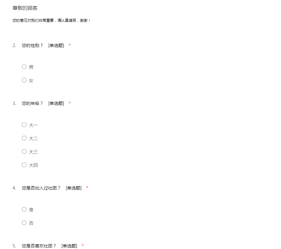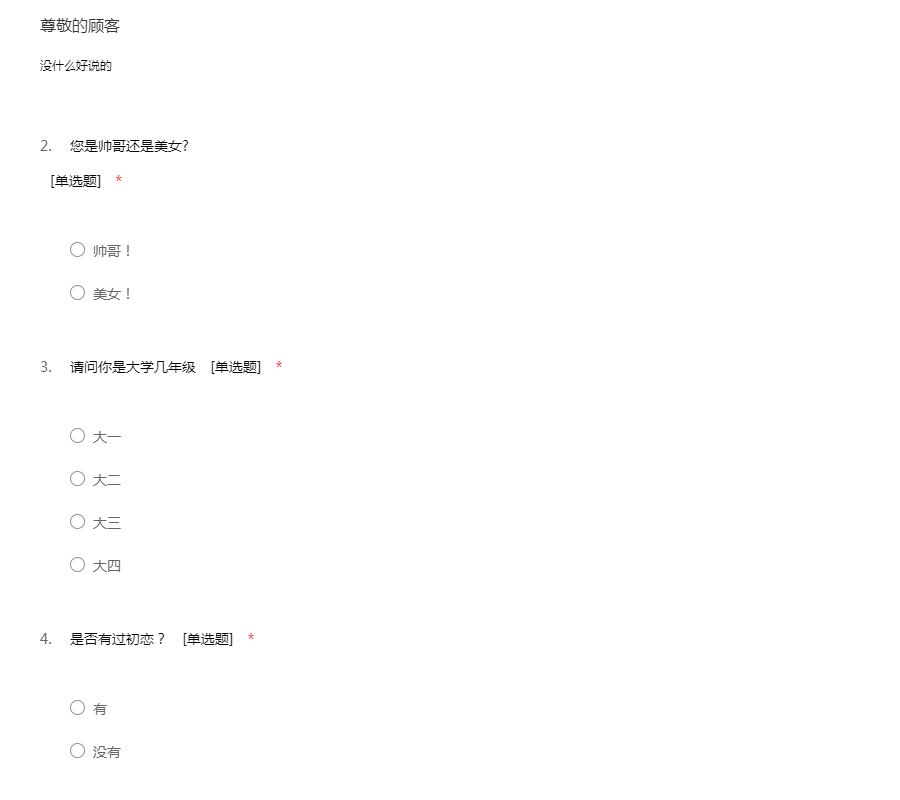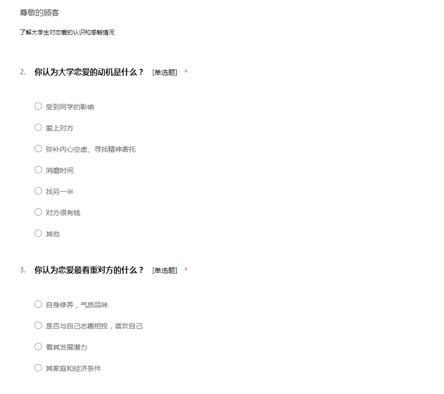 亲爱的同学:你好!为了更好地了解大家的恋爱观及恋爱状况,为大家现在或以后可能遇到的问题提供帮助,我们特设计此问卷。问卷所用数据均用于统计分析且为匿名调查,我们会保护你的隐私权,望如实回答。非常感谢你的支持。