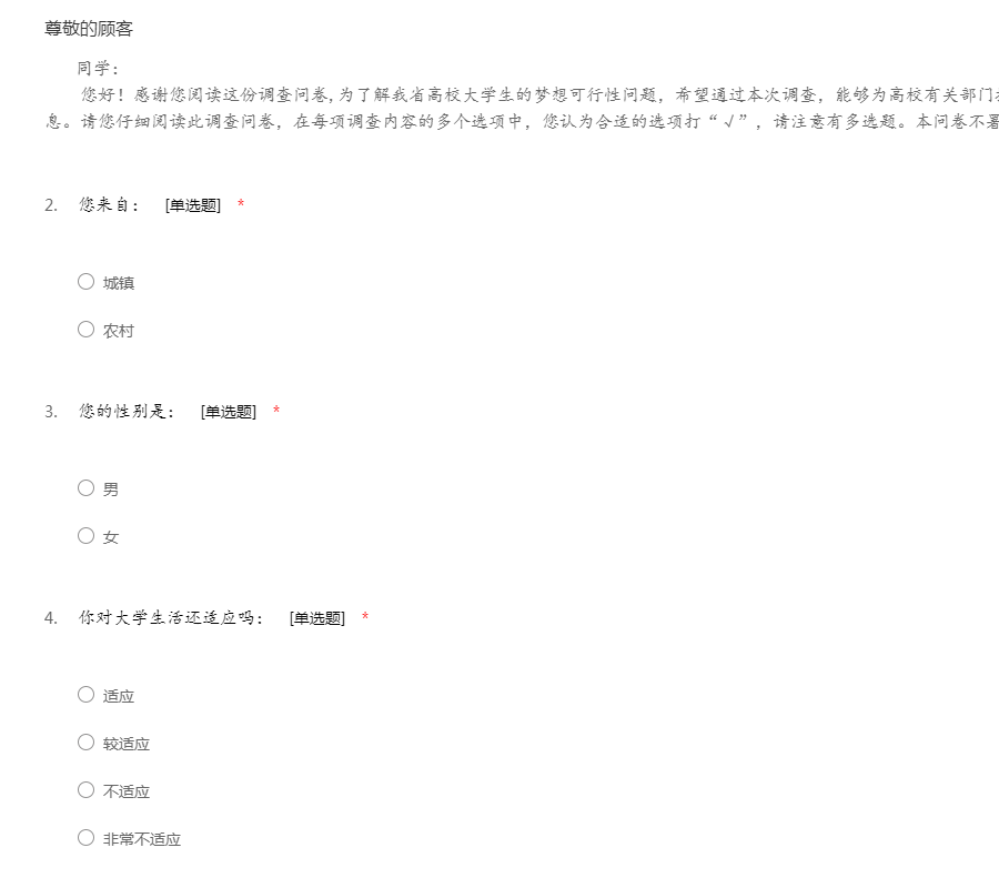 同学: 您好!感谢您阅读这份调查问卷,为了解我省高校大学生的梦想可行性问题,希望通过本次调查,能够为高校有关部门提供大学生有梦想可行性的有价值信息。请您仔细阅读此调查问卷,在每项调查内容的多个选项中,您认为合适的选项打“√”,请注意有多选题。本问卷不署名,谢谢您的参与。