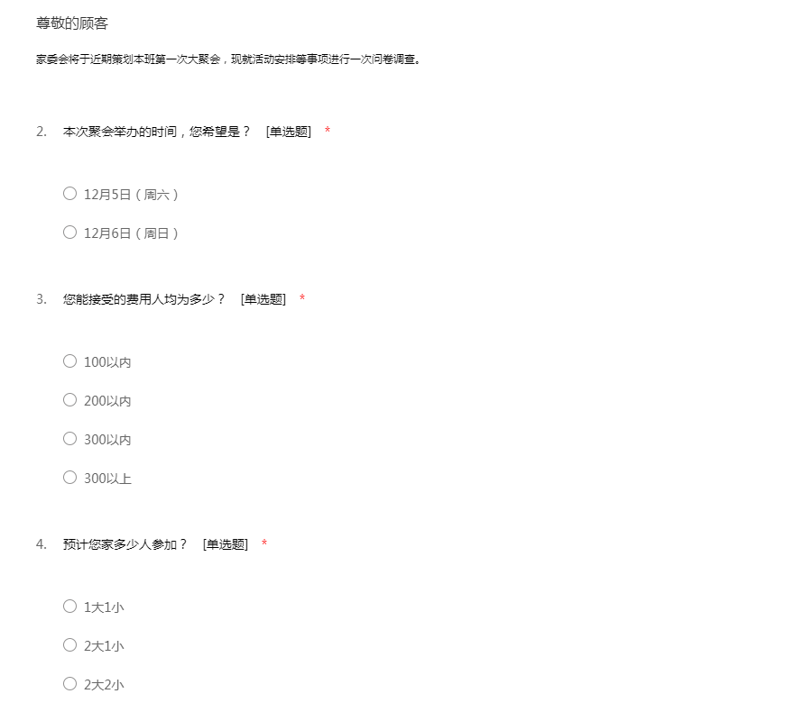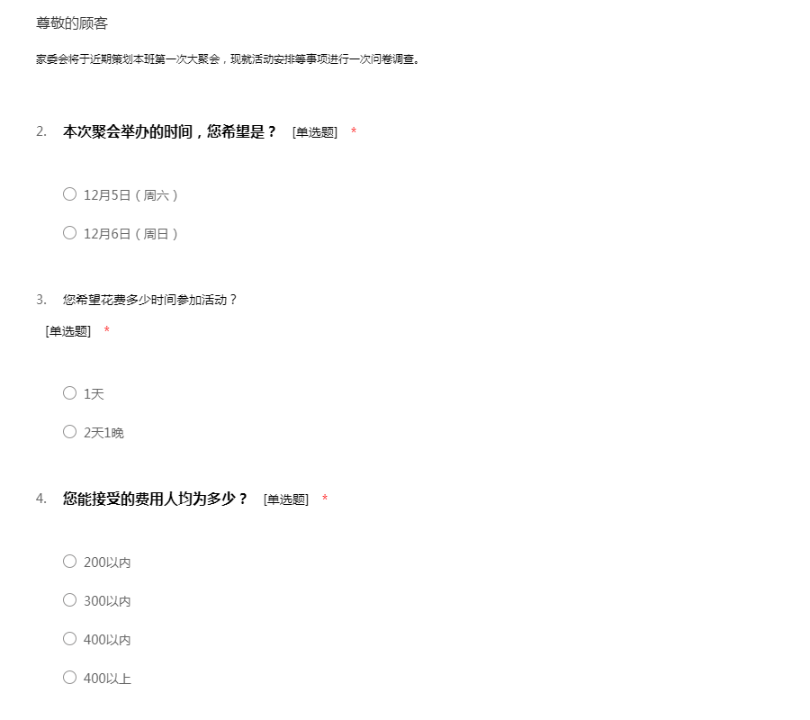 家委会将于近期策划本班第一次大聚会,现就活动安排等事项进行一次问卷调查。