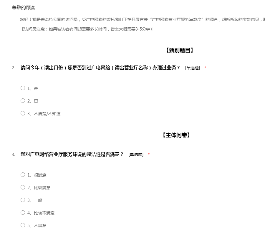 您好!我是盖洛特公司的访问员,受广电网络的委托我们正在开展有关“广电网络营业厅服务满意度”的调查,想听听您的宝贵意见,耽误您一些时间,可以吗?谢谢! 〖访问员注意:如果被访者有问起需要多长时间,告之大概需要3-5分钟〗