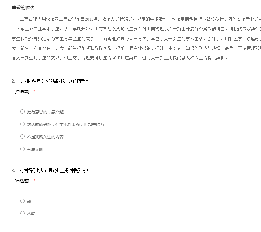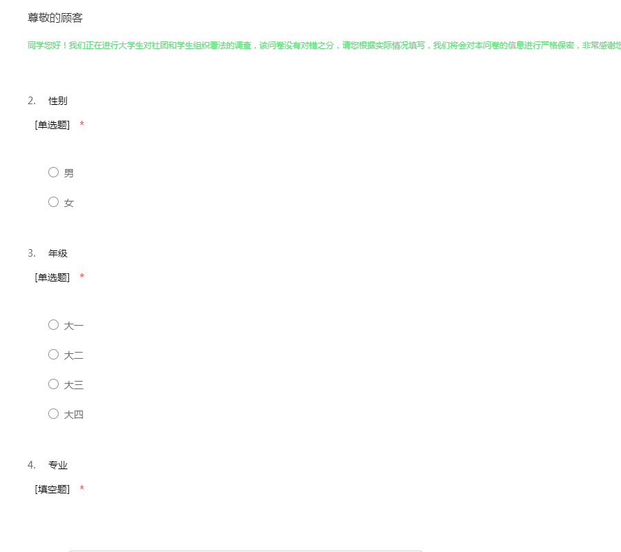 同学您好!我们正在进行大学生对社团和学生组织看法的调查,该问卷没有对错之分,请您根据实际情况填写,我们将会对本问卷的信息进行严格保密,非常感谢您的配合与支持~
