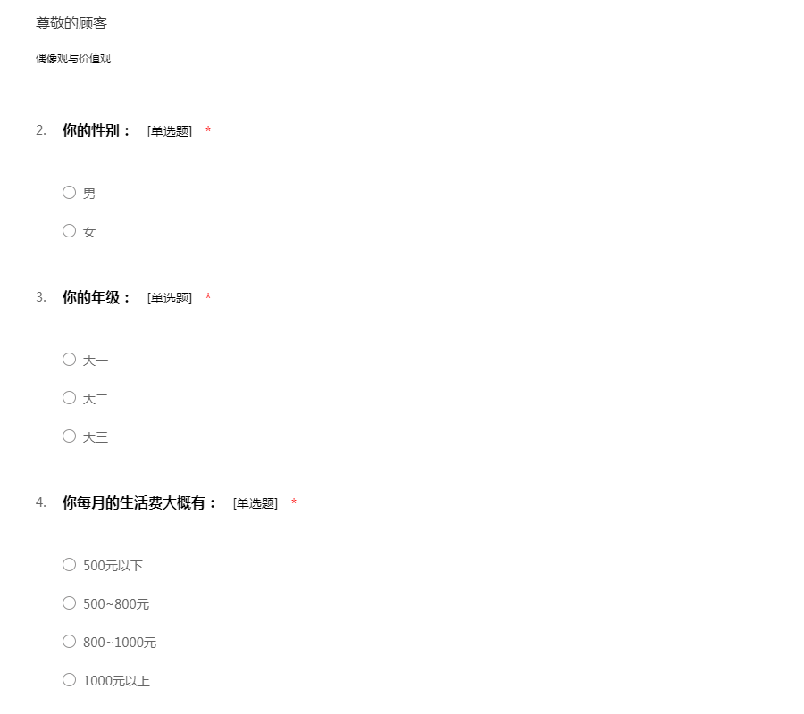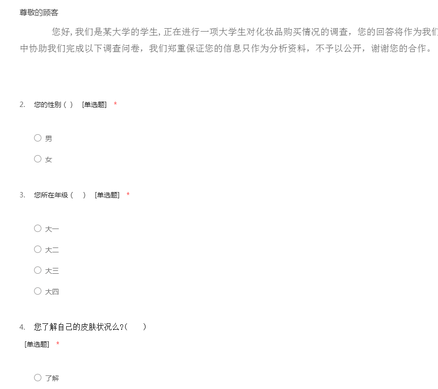 您好,我们是某大学的学生,正在进行一项大学生对化妆品购买情况的调查,您的回答将作为我们的重要参考,感谢您在百忙之中协助我们完成以下调查问卷,我们郑重保证您的信息只作为分析资料,不予以公开,谢谢您的合作。