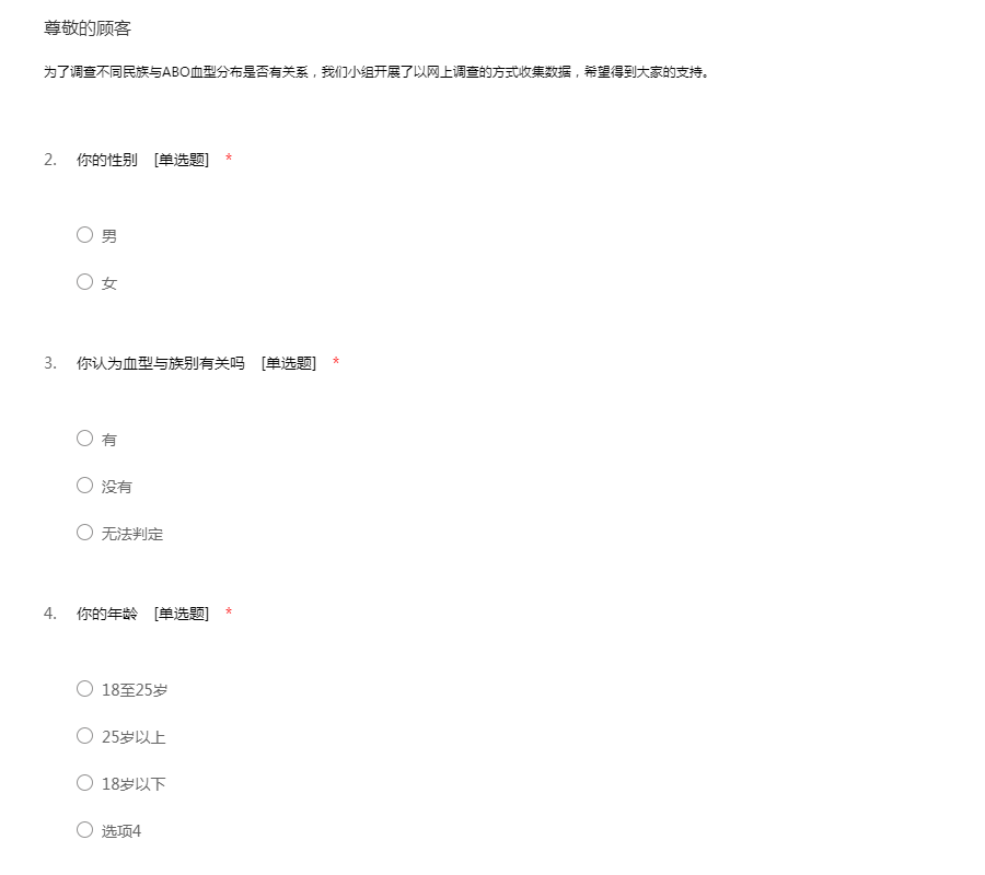 为了调查不同民族与ABO血型分布是否有关系,我们小组开展了以网上调查的方式收集数据,希望得到大家的支持。