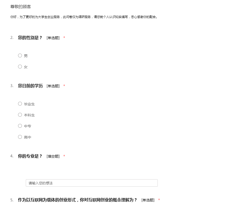 你好,为了更好的为大学生创业服务,此问卷仅为调研服务,请您就个人认识如实填写,忠心感谢你的配合。