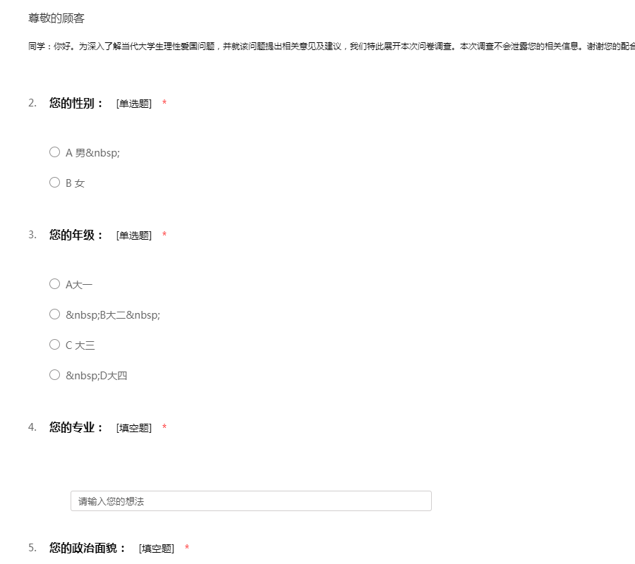 同学:你好。为深入了解当代大学生理性爱国问题,并就该问题提出相关意见及建议,我们特此展开本次问卷调查。本次调查不会泄露您的相关信息。谢谢您的配合!一基本信息