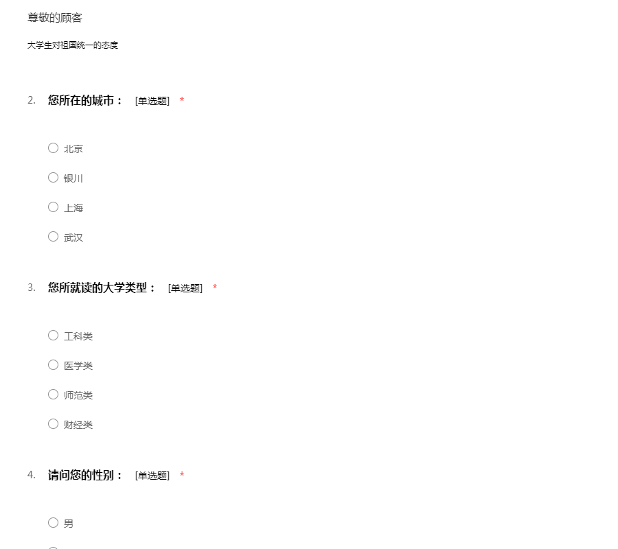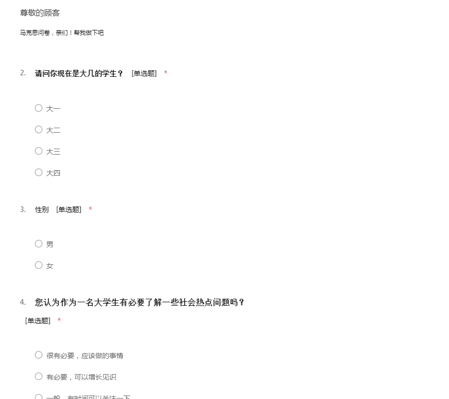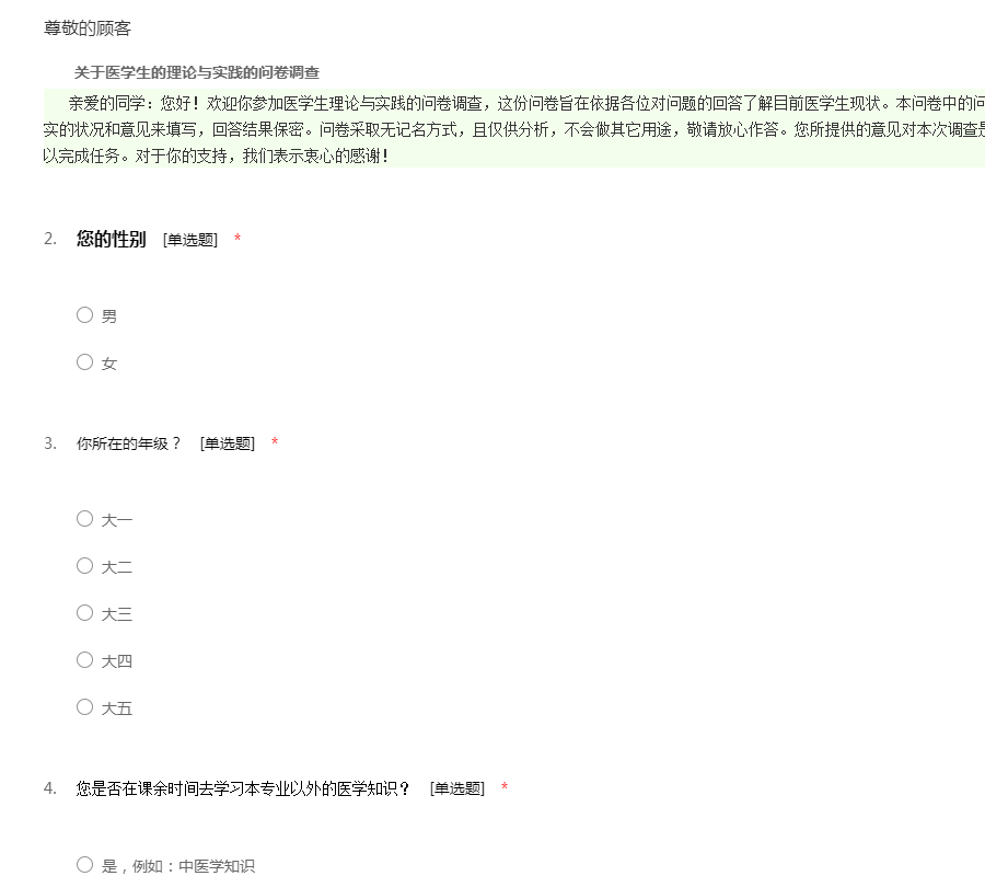 关于医学生的理论与实践的问卷调查 亲爱的同学:您好!欢迎你参加医学生理论与实践的问卷调查,这份问卷旨在依据各位对问题的回答了解目前医学生现状。本问卷中的问题并无对或错,所以同学们可依据您最真实的状况和意见来填写,回答结果保密。问卷采取无记名方式,且仅供分析,不会做其它用途,敬请放心作答。您所提供的意见对本次调查是非常宝贵的。没有你的帮助,我们将难以完成任务。对于你的支持,我们表示衷心的感谢!