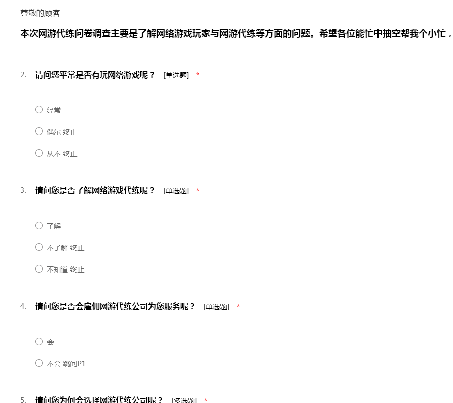 本次网游代练问卷调查主要是了解网络游戏玩家与网游代练等方面的问题。希望各位能忙中抽空帮我个小忙,谢谢。
