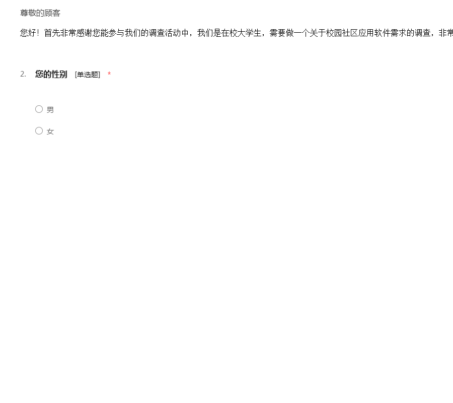 您好!首先非常感谢您能参与我们的调查活动中,我们是在校大学生,需要做一个关于校园社区应用软件需求的调查,非常希望您能配合我们的调查活动!