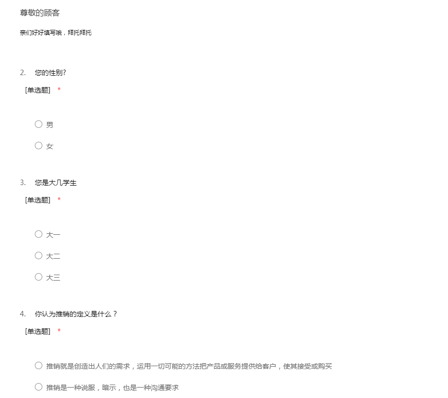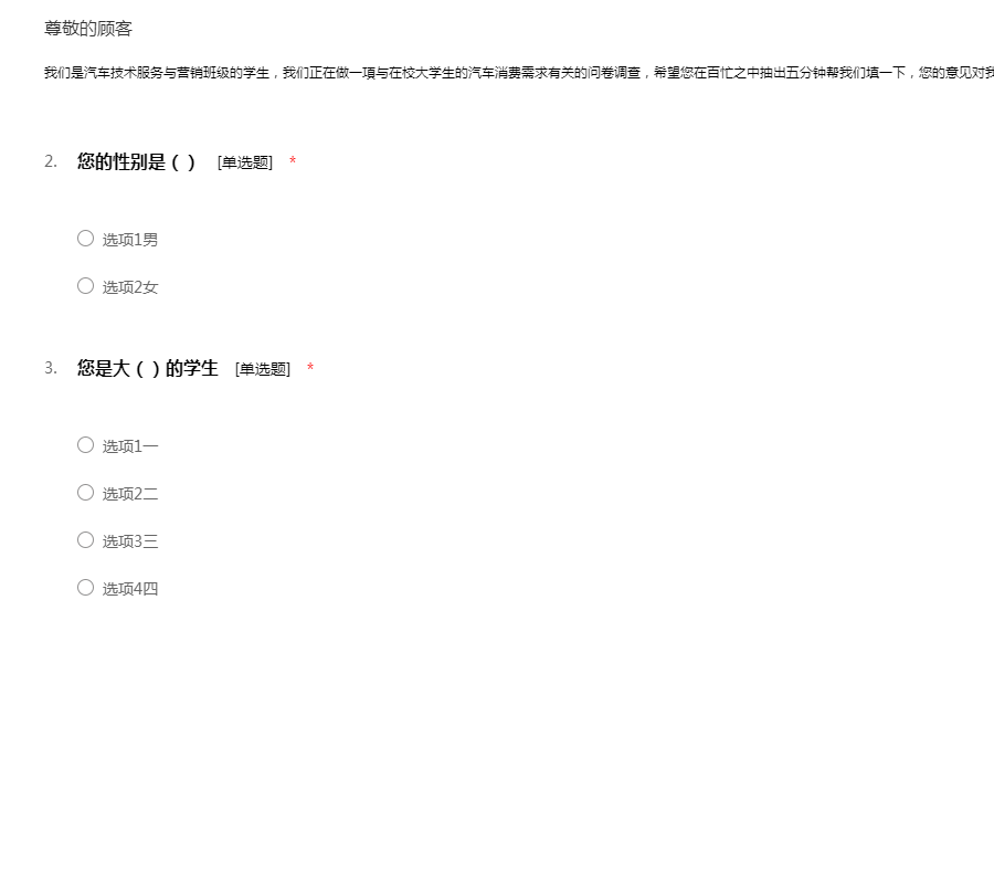 我们是汽车技术服务与营销班级的学生,我们正在做一項与在校大学生的汽车消费需求有关的问卷调查,希望您在百忙之中抽出五分钟帮我们填一下,您的意见对我们非常重要,请认真填写,谢谢!