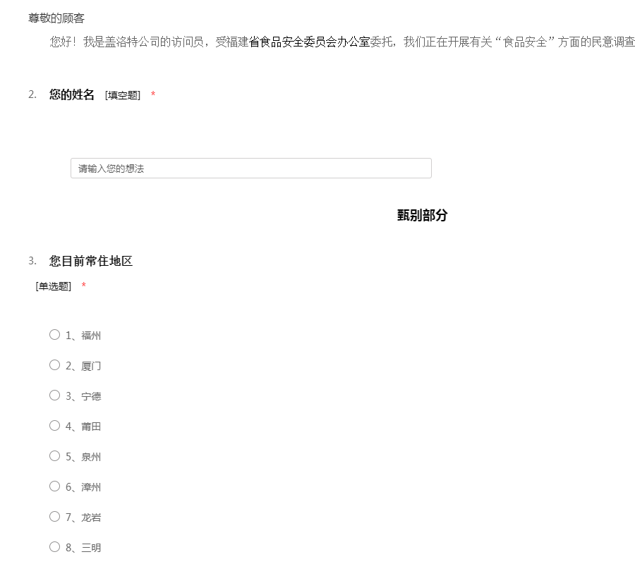 您好!我是盖洛特公司的访问员,受福建省食品安全委员会办公室委托,我们正在开展有关“食品安全”方面的民意调查,想听听您的宝贵意见,谢谢!