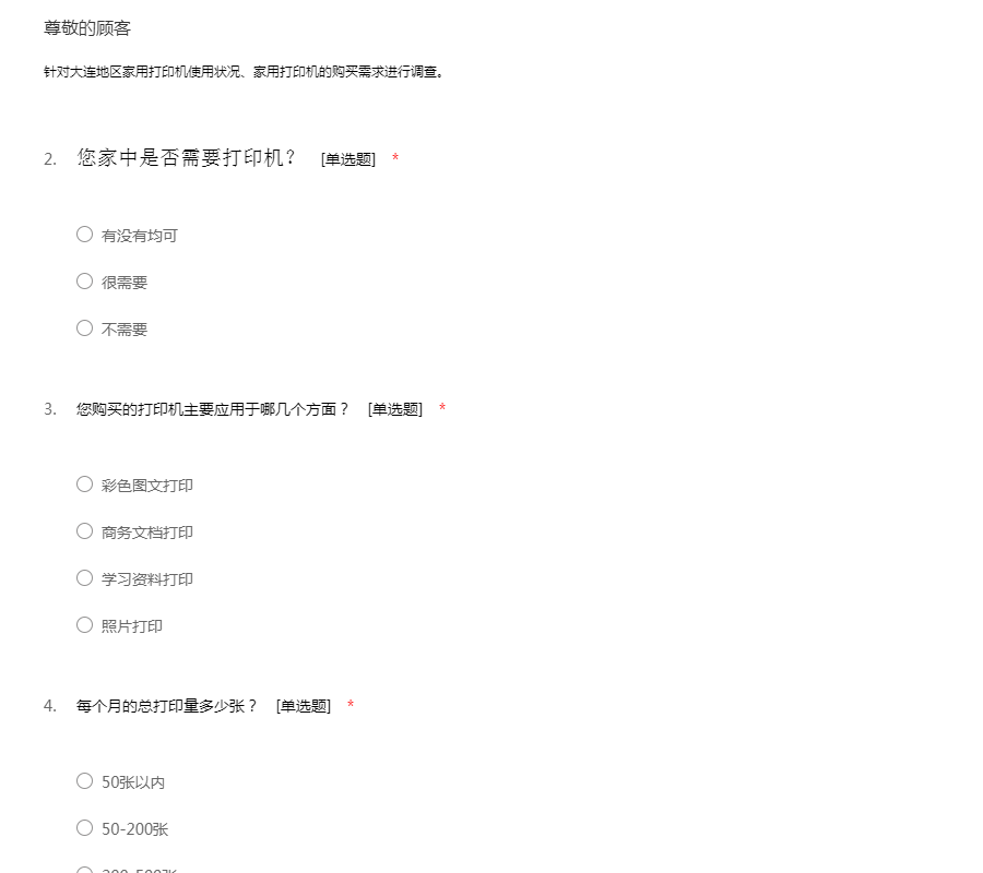 针对大连地区家用打印机使用状况、家用打印机的购买需求进行调查。