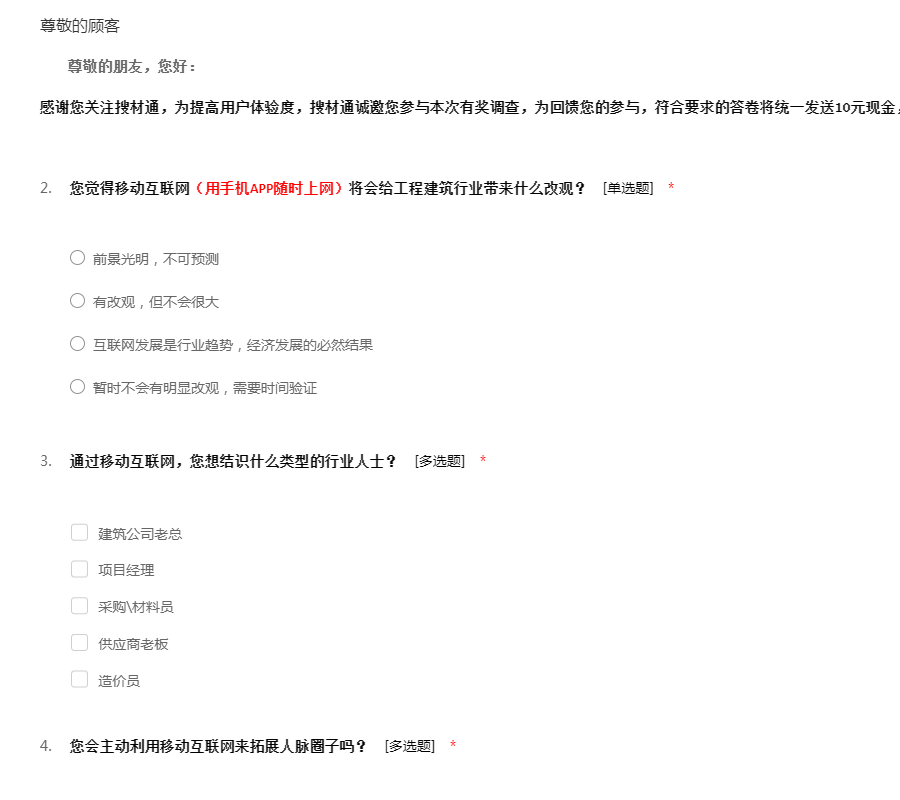尊敬的朋友,您好: 感谢您关注搜材通,为提高用户体验度,搜材通诚邀您参与本次有奖调查,为回馈您的参与,符合要求的答卷将统一发送10元现金,谢谢您的配合!