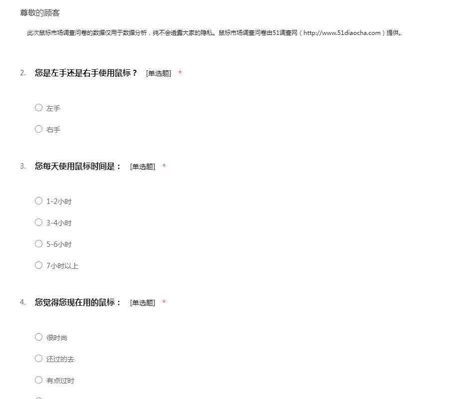 此次鼠标市场调查问卷的数据仅用于数据分析,纯不会透露大家的隐私。鼠标市场调查问卷由51调查网(http://www.51diaocha.com)提供。