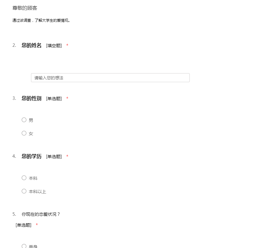本次问卷调查意在了解当代大学生的恋爱实际情况,您的真实回答对我们来说十分宝贵!感谢您在百忙之中回答此卷!51调查网(我要调查网)谢谢您的参与。