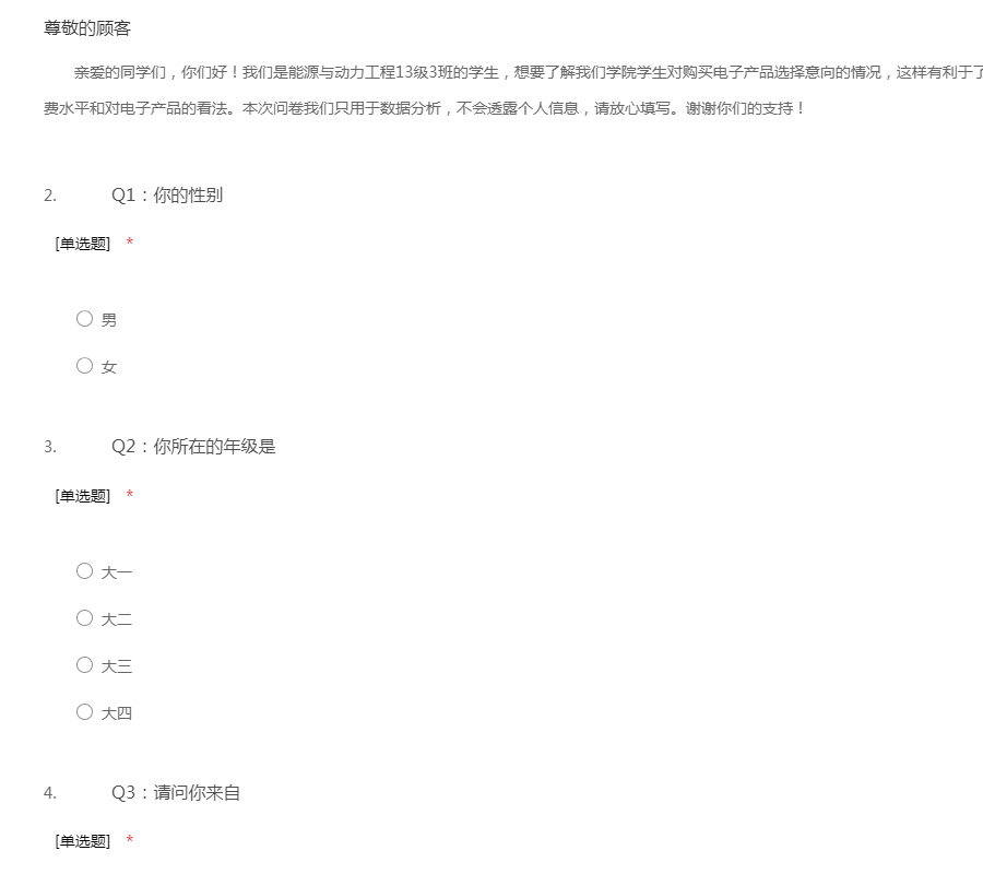 亲爱的同学们,你们好!我们是能源与动力工程13级3班的学生,想要了解我们学院学生对购买电子产品选择意向的情况,这样有利于了解一部分当代大学生的一些消费观念,消费水平和对电子产品的看法。本次问卷我们只用于数据分析,不会透露个人信息,请放心填写。谢谢你们的支持!