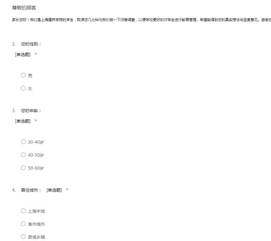 家长您好!我们是上海建桥学院的学生,耽误您几分钟为我们做一下问卷调查,以便学校更好的对学生进行教育管理。希望能得到您的真实想法与宝贵意见。谢谢您的合作!