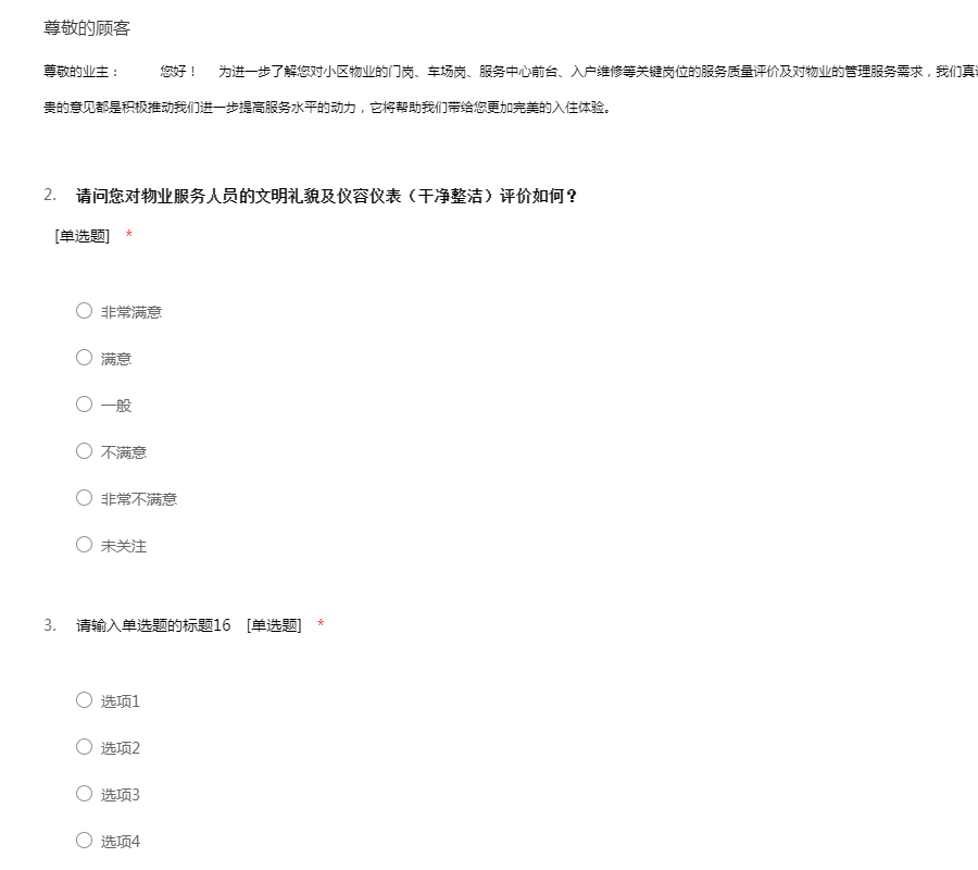 尊敬的业主: 您好! 为进一步了解您对小区物业的门岗、车场岗、服务中心前台、入户维修等关键岗位的服务质量评价及对物业的管理服务需求,我们真诚的邀请您完成下列问卷的填写,您的评价及宝贵的意见都是积极推动我们进一步提高服务水平的动力,它将帮助我们带给您更加完美的入住体验。