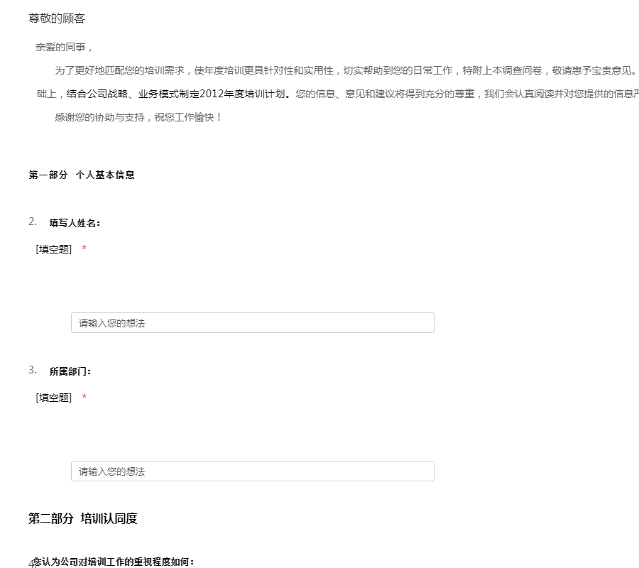 亲爱的同事, 为了更好地匹配您的培训需求,使年度培训更具针对性和实用性,切实帮助到您的日常工作,特附上本调查问卷,敬请惠予宝贵意见。我们将在对您的反馈进行细致分析的基础上,结合公司战略、业务模式制定2012年度培训计划。您的信息、意见和建议将得到充分的尊重,我们会认真阅读并对您提供的信息严格保密。 感谢您的协助与支持,祝您工作愉快!