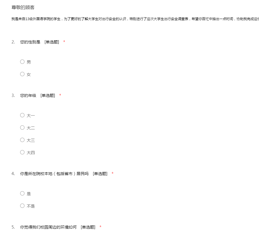 我是来自13级外国语学院的学生,为了更好的了解大学生对出行安全的认识,特别进行了这次大学生出行安全调查表,希望你百忙中抽出一点时间,协助我完成这份调查报告,谢谢您的协助与支持。