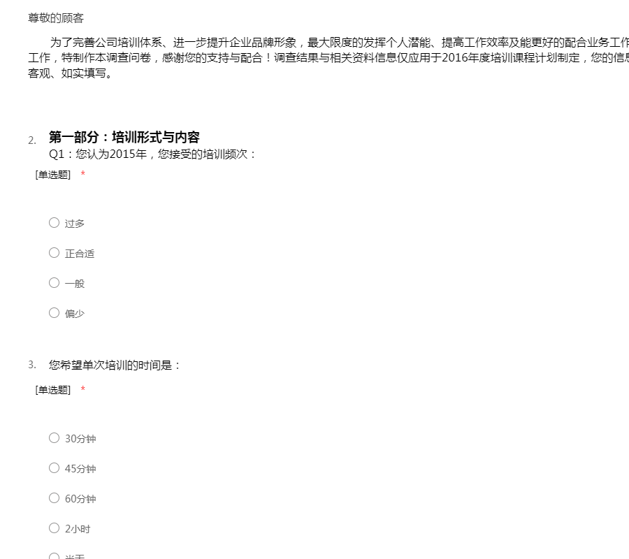 为了完善公司培训体系、进一步提升企业品牌形象,最大限度的发挥个人潜能、提高工作效率及能更好的配合业务工作的需要,有针对性的展开全员培训工作,特制作本调查问卷,感谢您的支持与配合!调查结果与相关资料信息仅应用于2016年度培训课程计划制定,您的信息、意见和建议将得到充分尊重,请客观、如实填写。