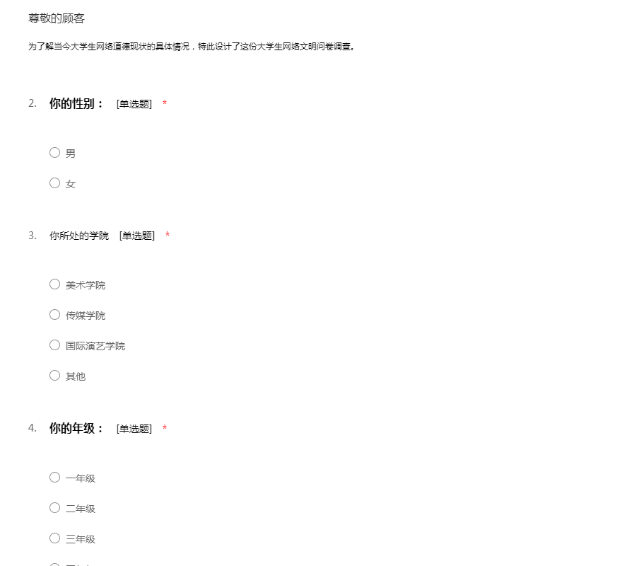 为了解当今大学生网络道德现状的具体情况,特此设计了这份大学生网络文明问卷调查。