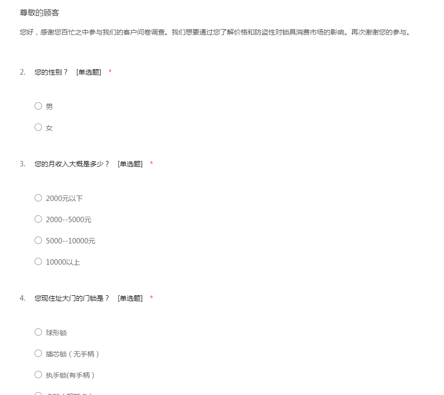 您好,感谢您百忙之中参与我们的客户问卷调查。我们想要通过您了解价格和防盗性对锁具消费市场的影响。再次谢谢您的参与。