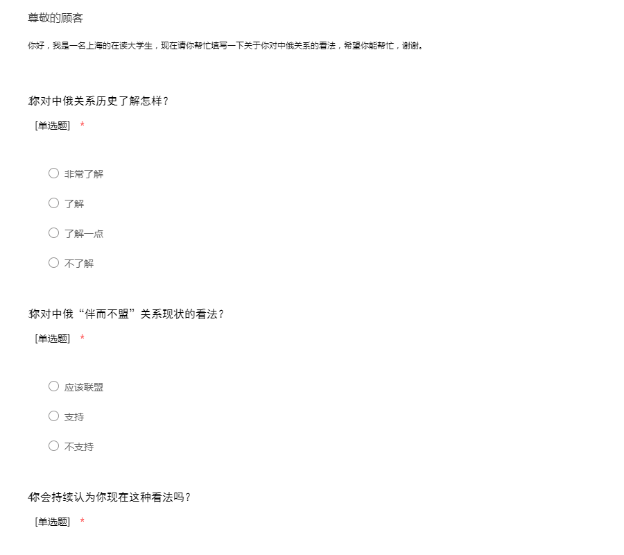你好,我是一名上海的在读大学生,现在请你帮忙填写一下关于你对中俄关系的看法,希望你能帮忙,谢谢。