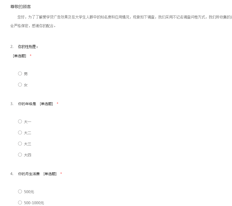 您好,为了了解爱学贷广告效果及在大学生人群中的知名度和应用情况,现做如下调查,我们采用不记名调查问卷方式,我们所收集的资料只做学术方面的研究,对您的答卷将会严格保密,感谢你的配合。