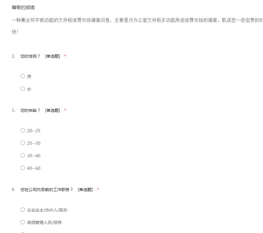 一种集合写字板功能的文件柜消费市场调查问卷,主要是对办公室文件柜多功能用途消费市场的调查。耽误您一些宝贵的时间,谢谢您的配合,祝您生活愉快!
