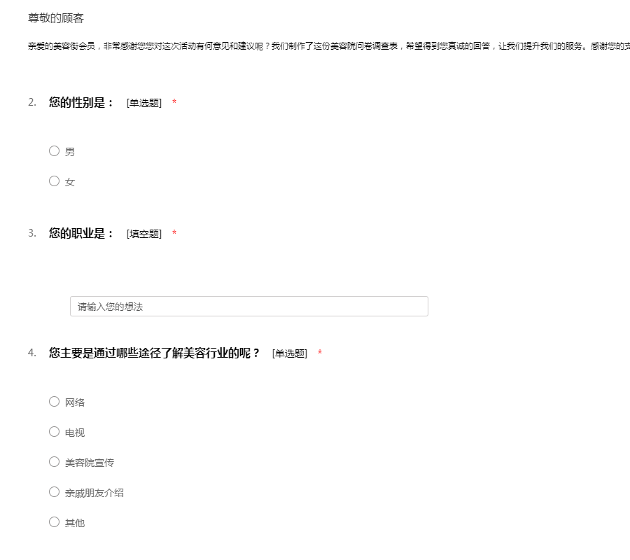 亲爱的美容街会员,非常感谢您您对这次活动有何意见和建议呢?我们制作了这份美容院问卷调查表,希望得到您真诚的回答,让我们提升我们的服务。感谢您的支持与合作!