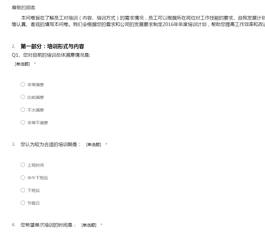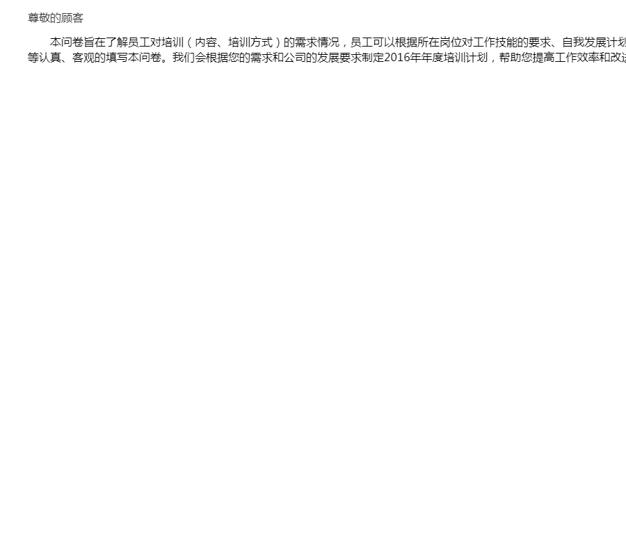 本问卷旨在了解员工对培训(内容、培训方式)的需求情况,员工可以根据所在岗位对工作技能的要求、自我发展计划及公司发展对自身素质提升的要求等认真、客观的填写本问卷。我们会根据您的需求和公司的发展要求制定2016年年度培训计划,帮助您提高工作效率和改进工作绩效。