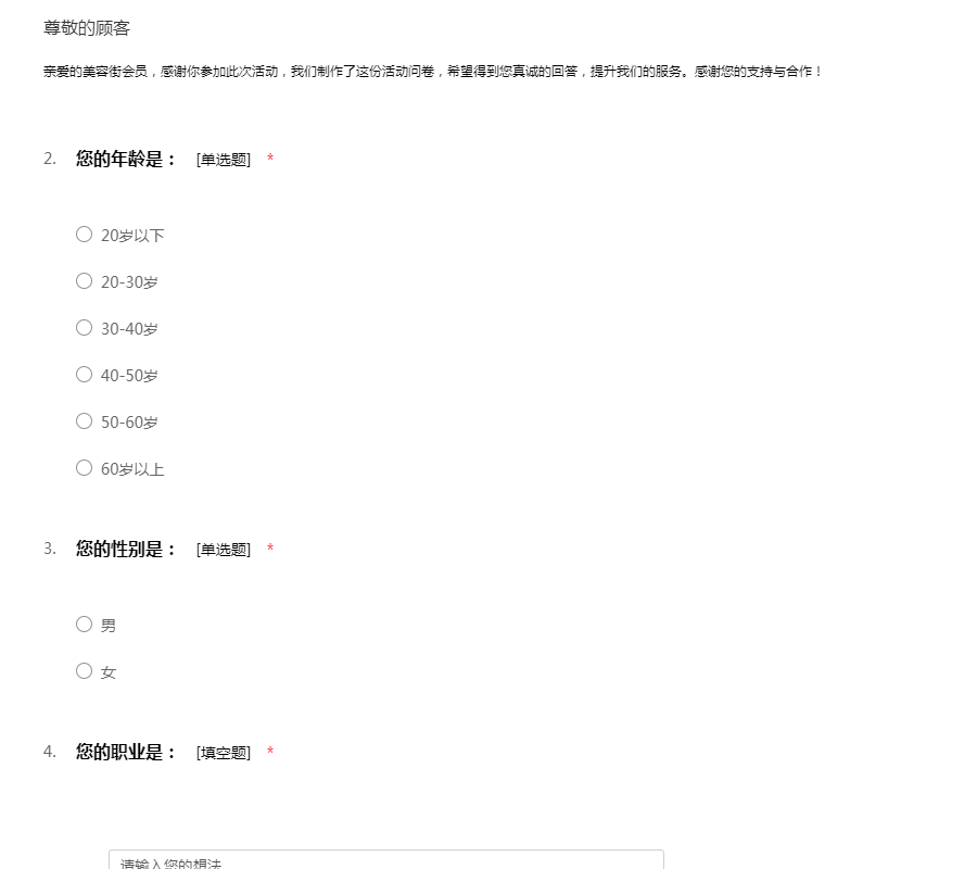 亲爱的美容街会员,感谢你参加此次活动,我们制作了这份活动问卷,希望得到您真诚的回答,提升我们的服务。感谢您的支持与合作!