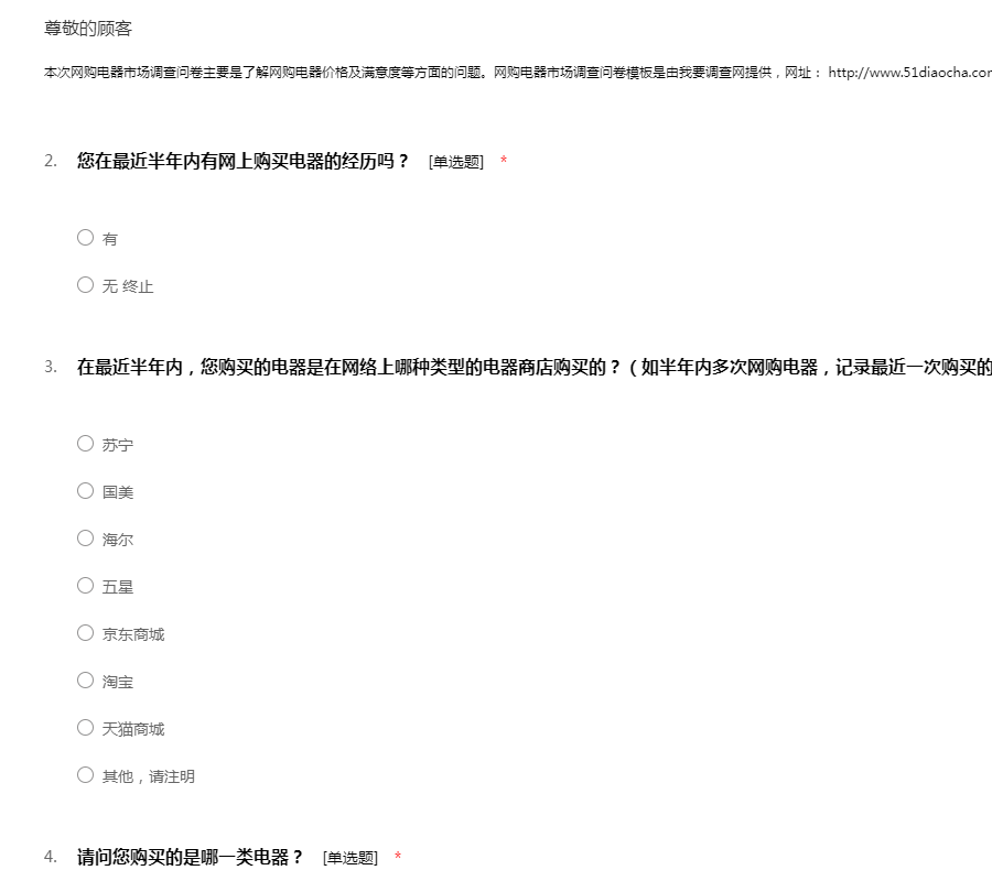 本次网购电器市场调查问卷主要是了解网购电器价格及满意度等方面的问题。网购电器市场调查问卷模板是由我要调查网提供,网址: http://www.51diaocha.com
