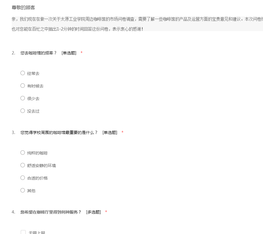 亲,我们现在在做一次关于太原工业学院周边咖啡馆的市场问卷调查,需要了解一些咖啡馆的产品及运营方面的宝贵意见和建议。本次问卷绝对不泄露您的个人信息,请放心!同时也对您能在百忙之中抽出1-2分钟的时间回答这份问卷,表示衷心的感谢!