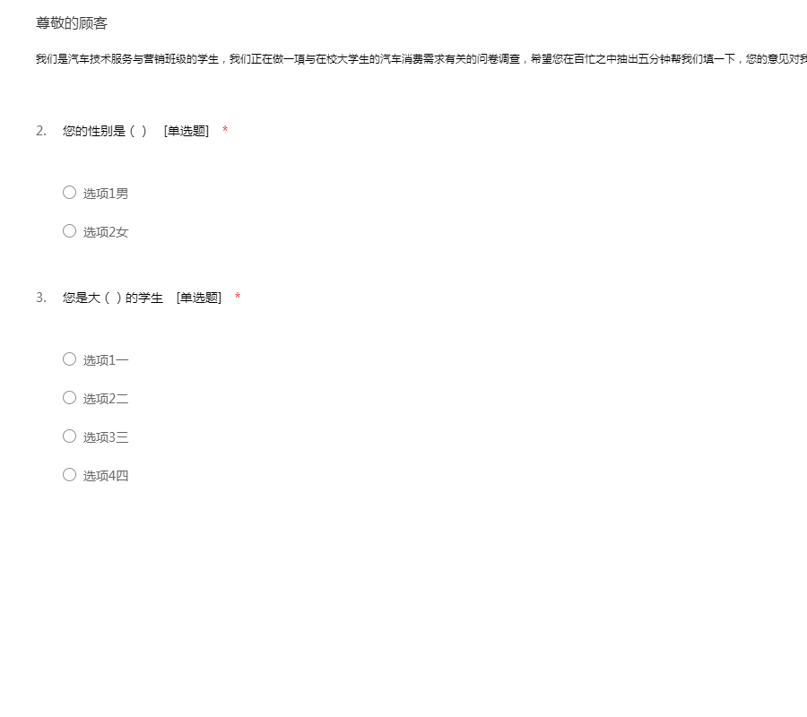 我们是汽车技术服务与营销班级的学生,我们正在做一項与在校大学生的汽车消费需求有关的问卷调查,希望您在百忙之中抽出五分钟帮我们填一下,您的意见对我们非常重要,请认真填写,谢谢!
