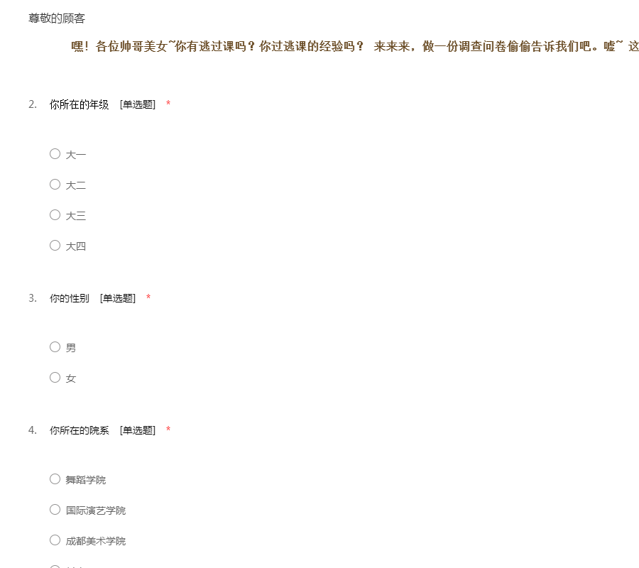 嘿!各位帅哥美女~你有逃过课吗?你过逃课的经验吗? 来来来,做一份调查问卷偷偷告诉我们吧。嘘~ 这是个秘密,我不会告诉别人的~