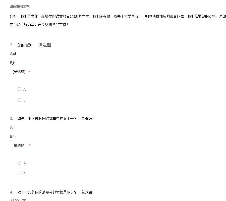您好,我们是文化与传播学院语文教育142班的学生,我们正在做一项关于大学生双十一购物消费情况的调查问卷。我们需要您的支持,希望您能认真阅读下列题目,并根据自己的真实经验进行填写,再次感谢您的支持!