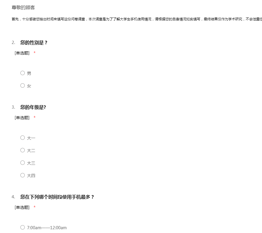 首先,十分感谢您抽出时间来填写这份问卷调查,本次调查是为了了解大学生手机使用情况,请根据您的自身情况如实填写,最终结果仅作为学术研究,不会泄露您的个人资料,感谢您的配合!