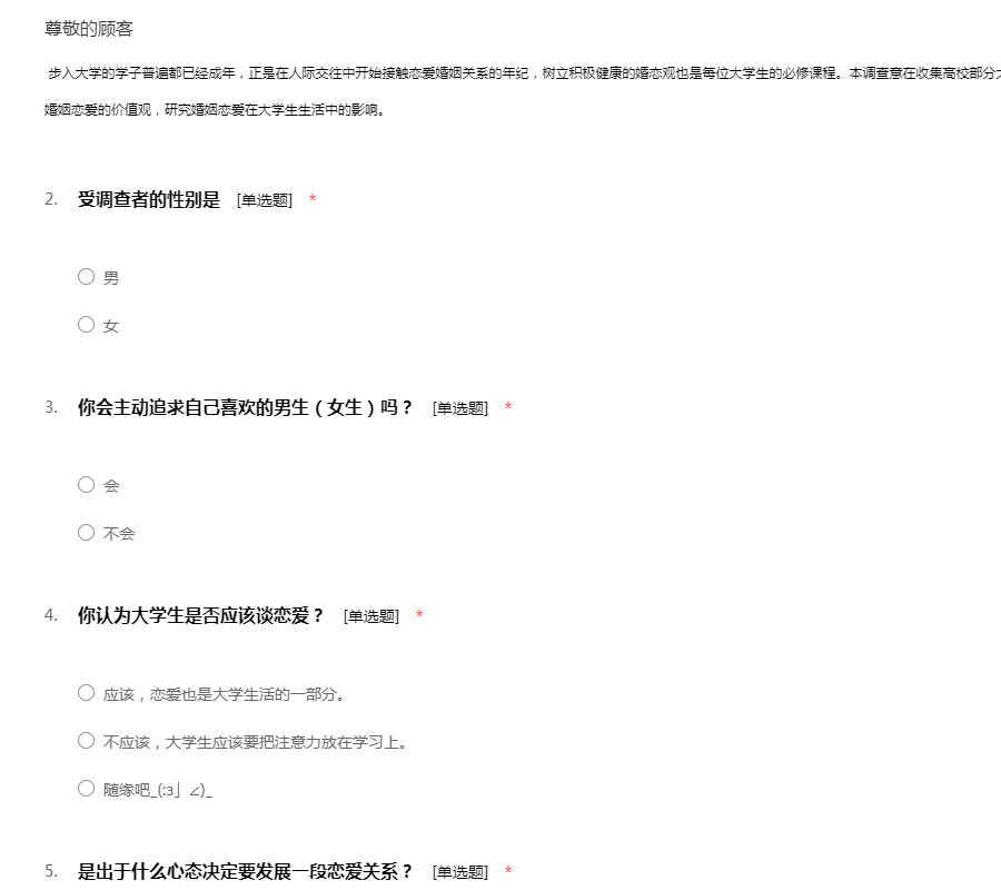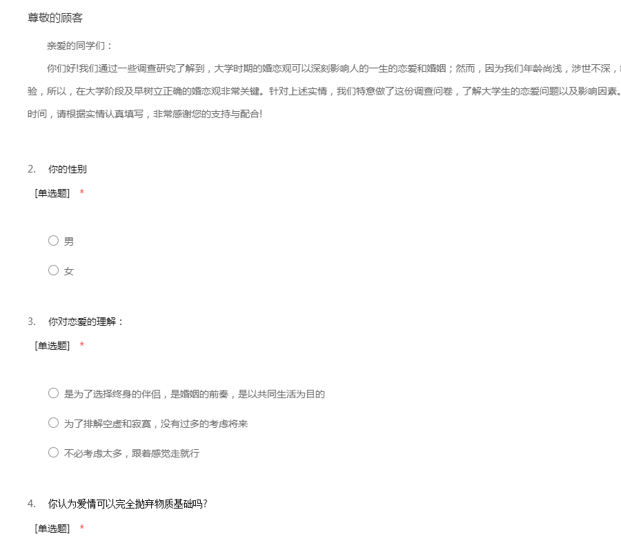 亲爱的同学们:你们好!我们通过一些调查研究了解到,大学时期的婚恋观可以深刻影响人的一生的恋爱和婚姻;然而,因为我们年龄尚浅,涉世不深,缺乏深入了解以及正确判断一个人的经验,所以,在大学阶段及早树立正确的婚恋观非常关键。针对上述实情,我们特意做了这份调查问卷,了解大学生的恋爱问题以及影响因素。本调查采取匿名制,只会耽误您几分钟时间,请根据实情认真填写,非常感谢您的支持与配合!