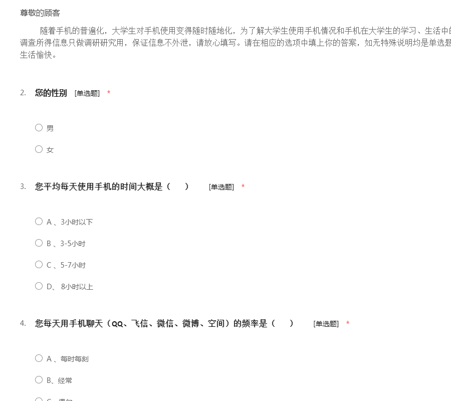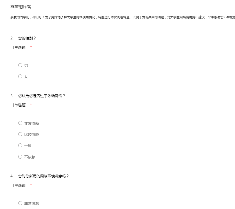 亲爱的同学们,你们好!为了更好地了解大学生网络使用情况,特别进行本次问卷调查,以便于发现其中的问题,对大学生网络使用提出建议,非常感谢您不辞繁忙填写此问卷!