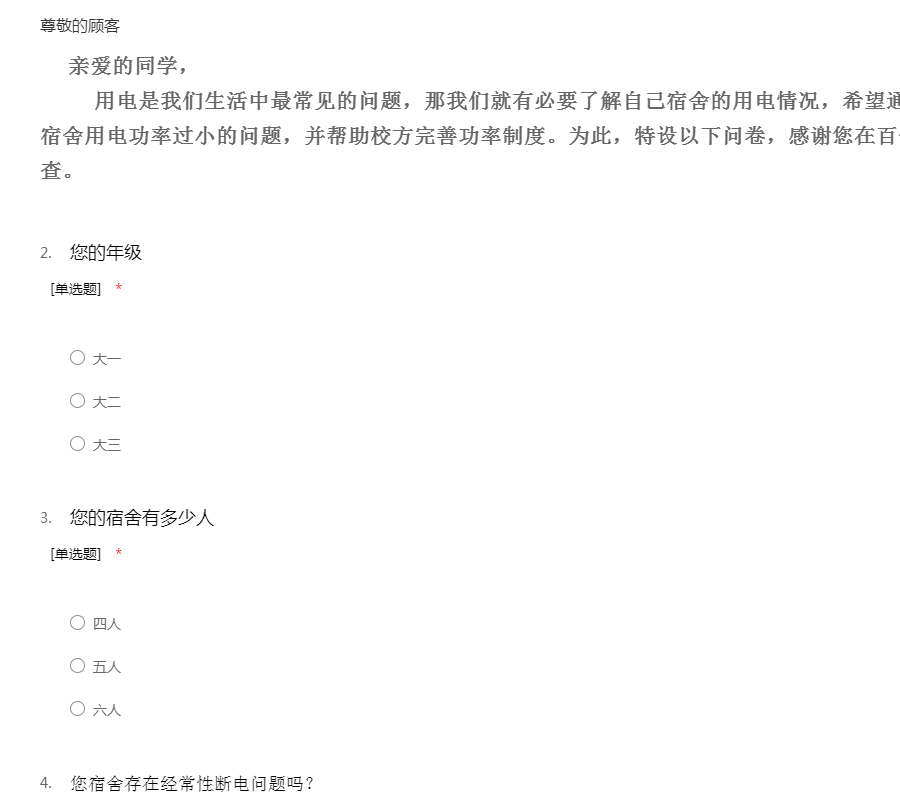 亲爱的同学,用电是我们生活中最常见的问题,那我们就有必要了解自己宿舍的用电情况,希望通过本次调查能解决同学们宿舍用电功率过小的问题,并帮助校方完善功率制度。为此,特设以下问卷,感谢您在百忙之中抽出时间来接受调查。