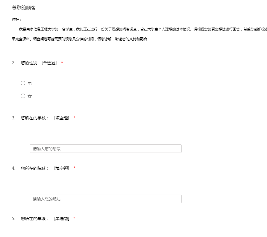 你好: 我是南京信息工程大学的一名学生,我们正在进行一份关于理想的问卷调查,旨在大学生个人理想的基本情况。请根据您的真实想法进行回答,希望您能积极参与,该问卷实行匿名调查,我们将对您的调查结果完全保密。调查问卷可能需要耽误您几分钟的时间,请您谅解,谢谢您的支持和配合!