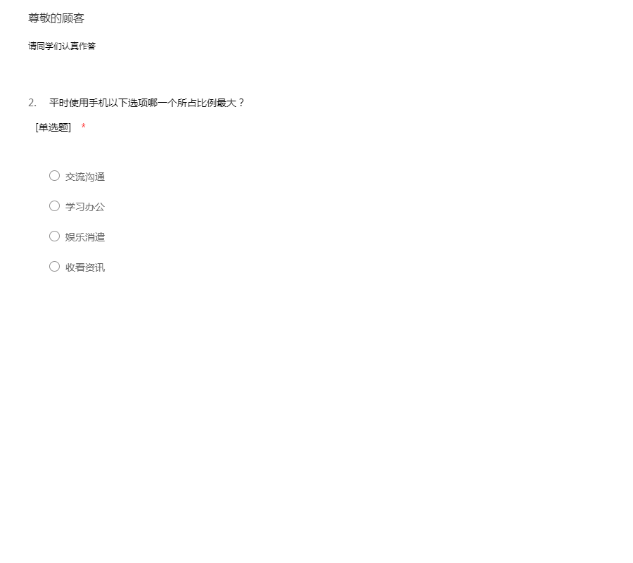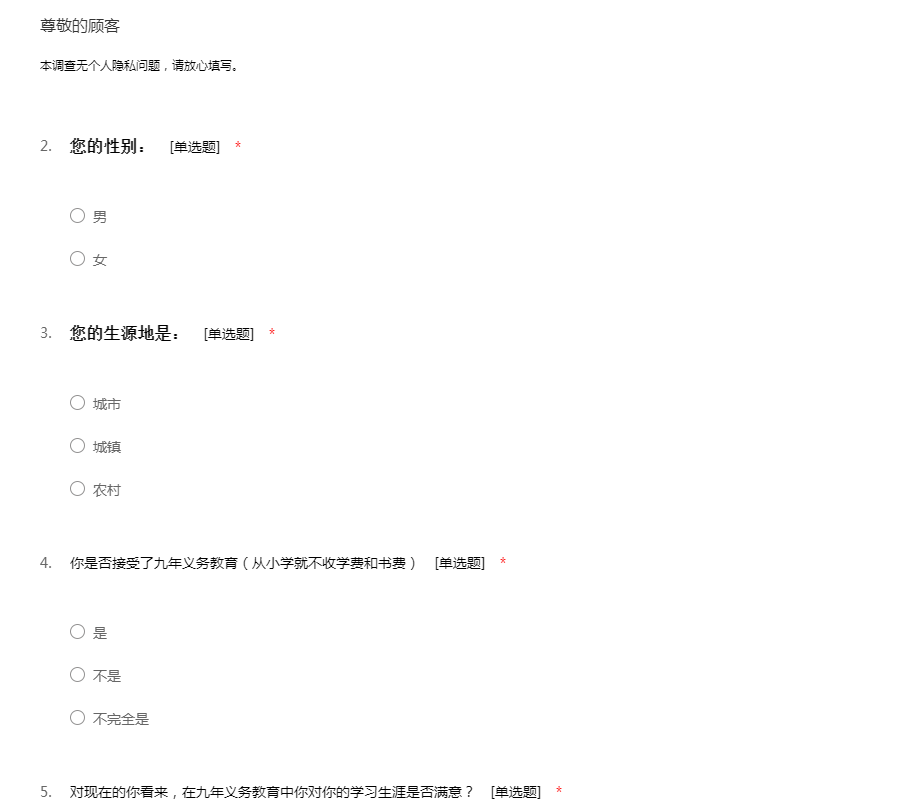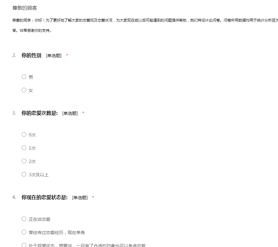 亲爱的同学:你好!为了更好地了解大家的恋爱观及恋爱状况,为大家现在或以后可能遇到的问题提供帮助,我们特设计此问卷。问卷所用数据均用于统计分析且为匿名调查,我们会保护你的隐私权,望如实回答。非常感谢你的支持。