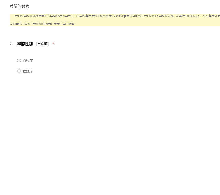 我们是学校正规社团太工青年创业社的学生,由于学校餐厅拥挤及校外外卖不能保证食品安全问题,我们得到了学校的允许,和餐厅合作启动了一个”餐厅外卖“的便民项目。现在希望大家能给一些宝贵的建议和意见,以便于我们更好的为广大太工学子服务。