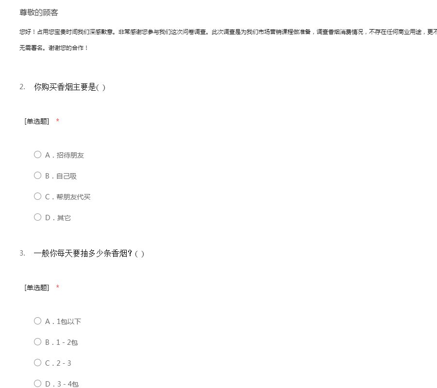 您好!占用您宝贵时间我们深感歉意。非常感谢您参与我们这次问卷调查。此次调查是为我们市场营销课程做准备,调查香烟消费情况,不存在任何商业用途,更不会泄露您的任何隐私。根据您的实际情况填写,无需署名。谢谢您的合作!