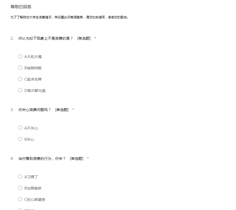 为了了解我校大学生浪费情况,特设置此问卷调查表,请您如实填写,谢谢您的配合。